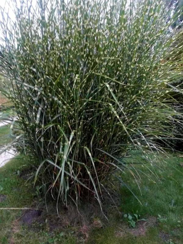 Ta trawa tworzy duże, gęste kępy o wysokości do 2 metrów. Bardzo efektowne liście są zielone i ozdobione poprzecznymi, kremowo-żółtymi, dość szerokimi paskami i dorastają do 1m długości. Roślina charakteryzuje się zwartym, wzniesionym pokrojem. Pod koniec lata ze szczytów źdźbeł wyłaniają się różowe kwiatostany. Kępy miskantów bardzo ciekawie i oryginalnie prezentują się późną jesienią, gdy zasuszone już pędy i liście pokryje srebrzysty szron lub przyprószy pierwszy śnieg. Preferuje gleby żyzne, raczej stale wilgotne, a stanowisko słoneczne i osłonięte. Zeszłoroczne źdźbła ścinamy wiosną. Rośliny w pojemnikach 3 l.